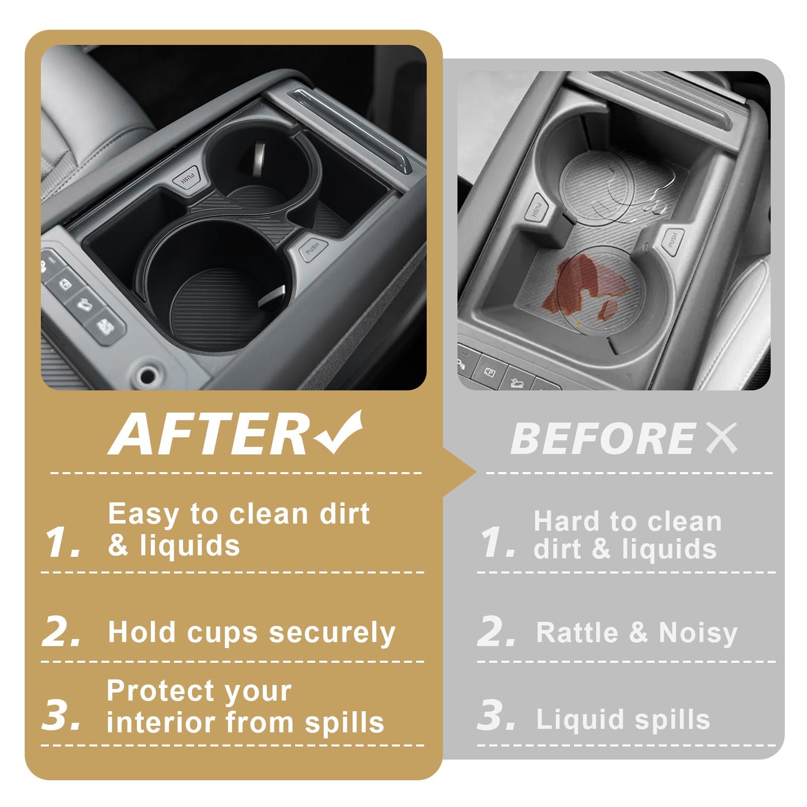 - Function: Maximize the storage space while keeping your cup in place without rattling. Perfectly organize your items neatly. Easy to clean, effortlessly keeping your cup holder area tidy. Provide full protection for your interior against scratches and damage.