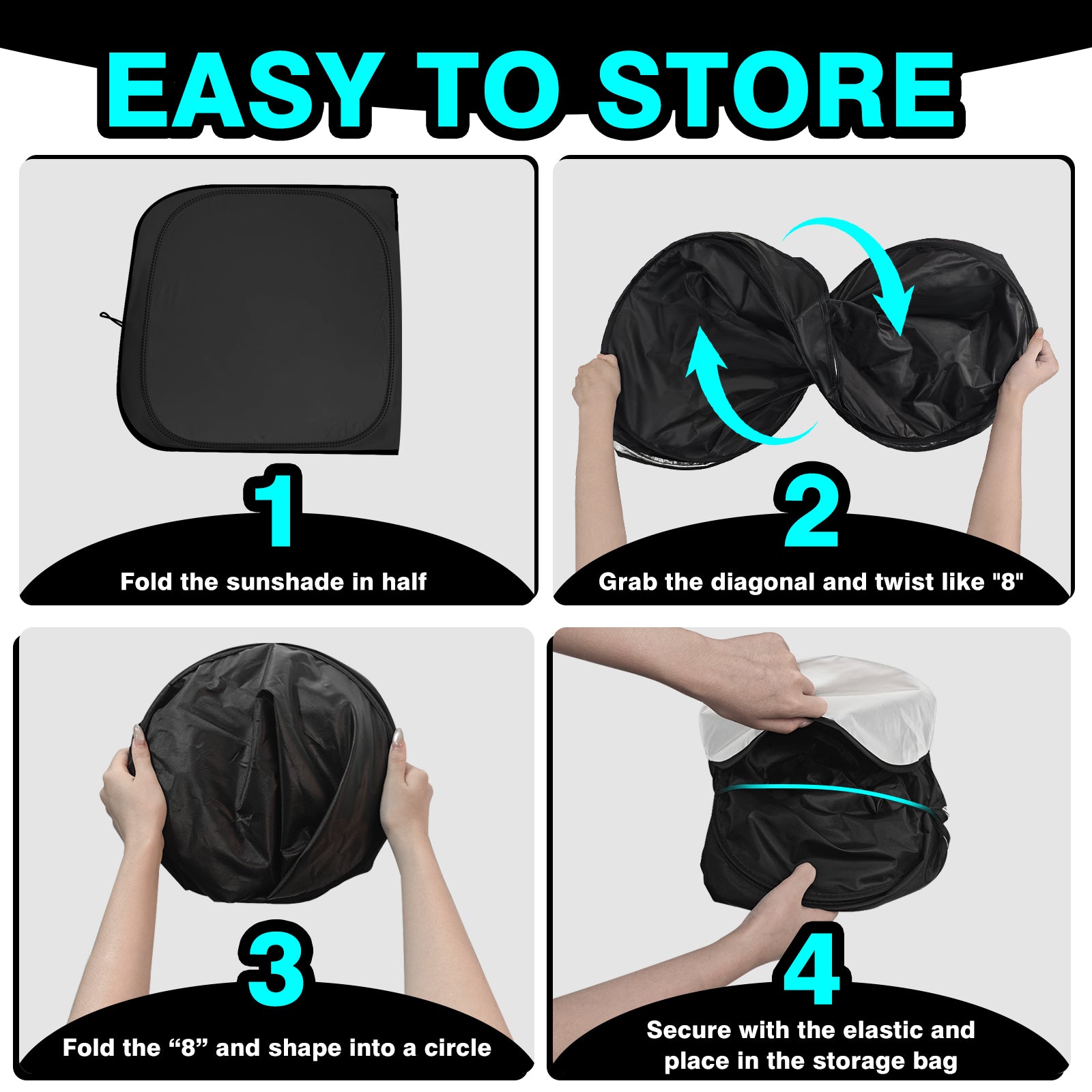 - Easy to Install: No tools needed. Fold the sunshade in half, grab the diagonal, and twist into a figure-8. Fold the figure-8 into a compact circle, secure with the elastic, and store in the bag.